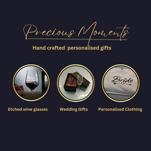 At Precious Moments, we create beautifully crafted, personalized items tailored to your needs! From etched wine glasses and champagne flutes to custom mugs, cups, aprons, and t-shirts – we've got the perfect gift for birthdays, weddings, anniversaries, and all of life's celebrations. Our Specialties Include:** Etched Wine Glasses Elegant Champagne Flutes Personalized Cups & Mugs Customized Aprons & T-Shirts Crafted with care, designed to make memories. Explore our collection and make every gift unforgettable!