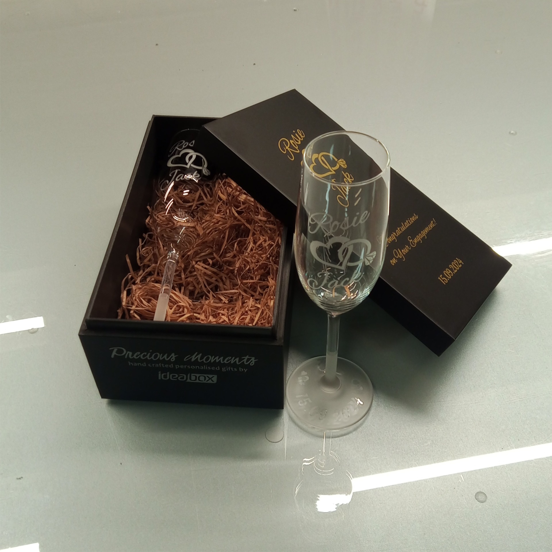 For custmized champagne flutes contact us for design and pricing. These come with personalized box.